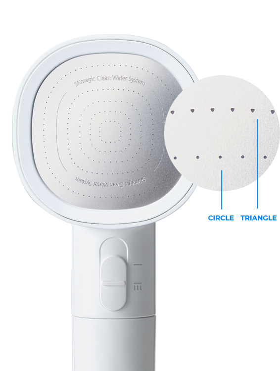 The circular holes concentrate the water flow, while the triangular holes maximize negative ion production.